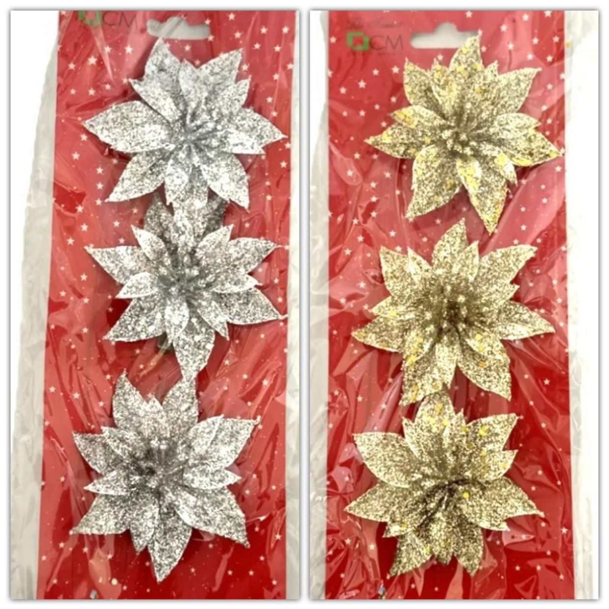 > Glitter Pointsettia 3pc Gold/Silver 8cm