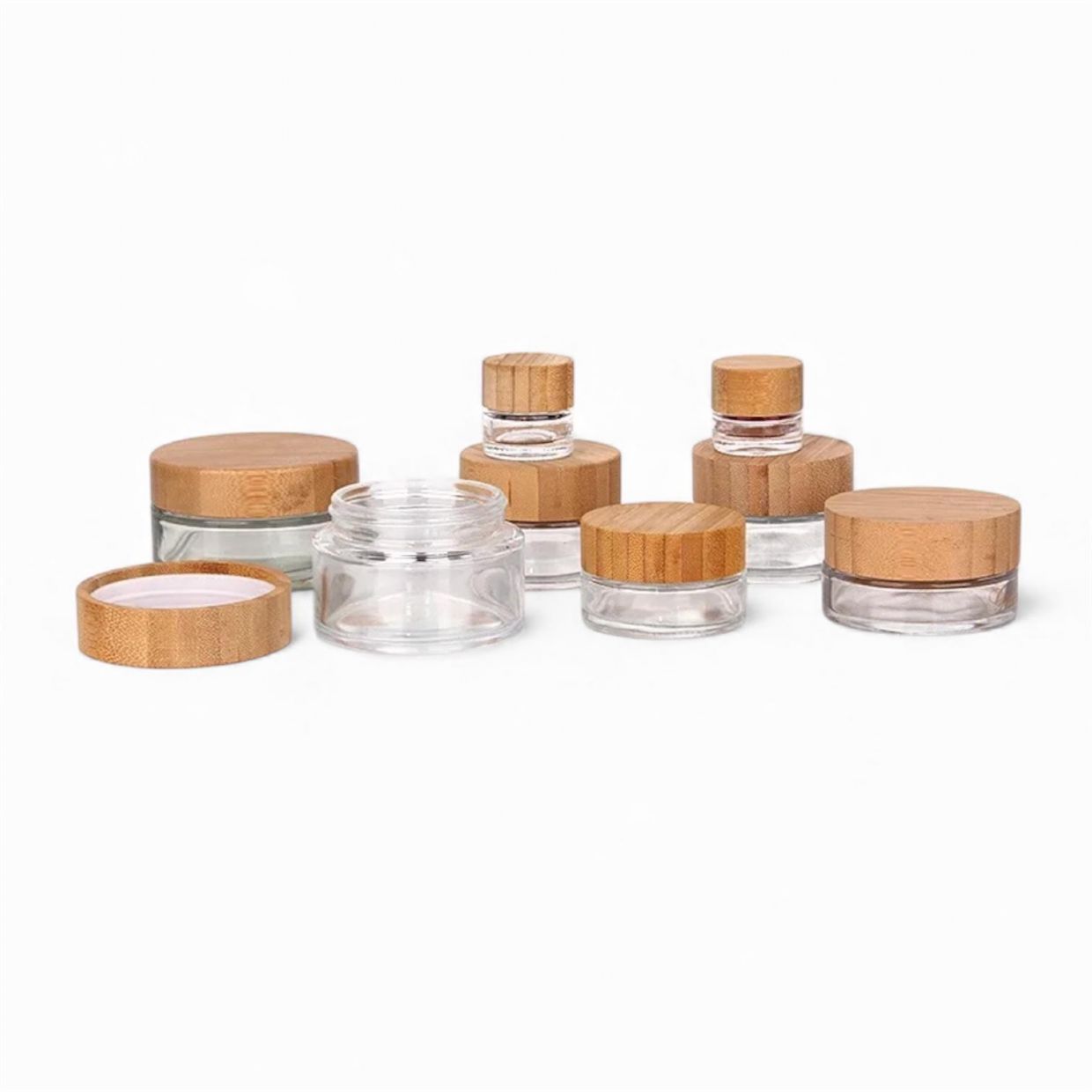 > Bamboo Lid Glass Bottles Asst. Sizes 3cmD